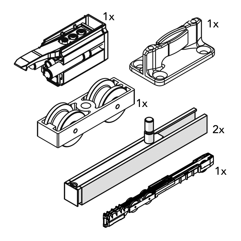 Garniture complète Junior 100 B sans rail, pour 1 vantail.Ferrure pour porte en bois à roulement par le haut jusqu'à 100 kg avec rail de roulement en applique ou affleurant avec le plafond.En option avec amortisseur.Pour vantail épaisseur : 35 à 80 mm.