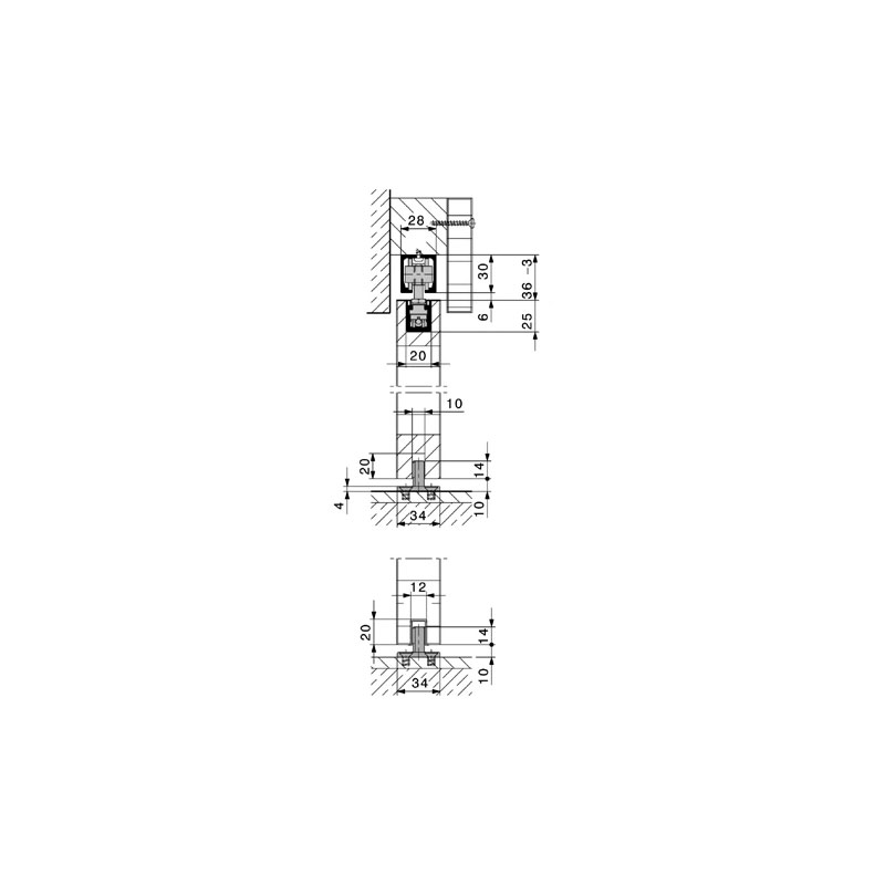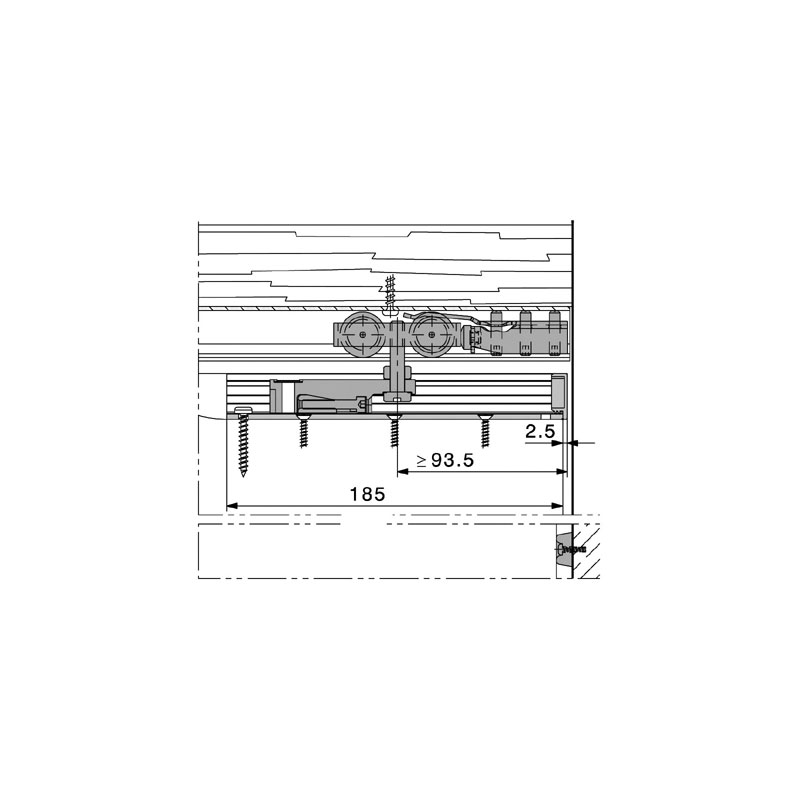 Junior 40B pocket => pour une installation à galandage. Jeu entre la porte et le rail, 6mm.La garniture complète 40B et 40B pocket sans rail pour un vantail se compose de :