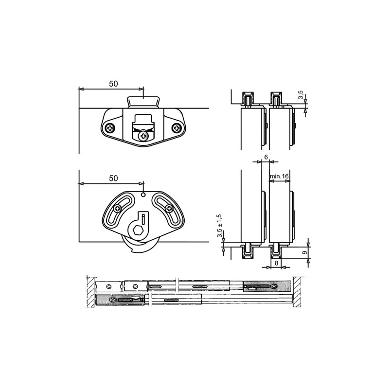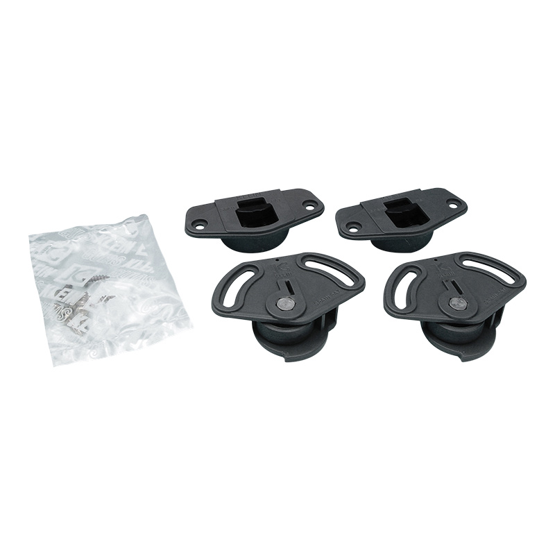 Ferrure pour portes coulissantes jusqu’à 22 kg par vantail.Garniture comprenant 2 guides haut et 2 galet bas.Pour vantail épaisseur 16 mm minimum.Livré sans rail.