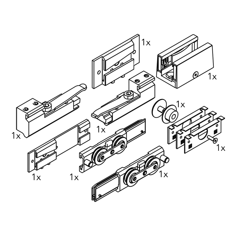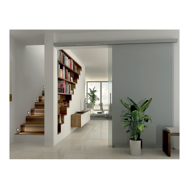 Ferrure avec suspension cachée dans le rail pour montage mural, au plafond ou intégré dans le plafond pour vantail en verre trempé. Fonctionnement silencieux et doux grâce aux chariots sur roulements à billes.