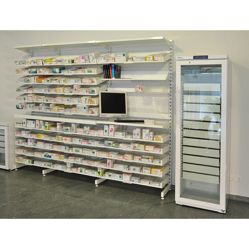 MEDIC STORAGE est un système de rangement ouvert pour pharmacie, utilisable également pour d'autres univers magasins.Il est composé de gondoles murales ou centrales, avec un maximum de 12 tiroirs inclinés et coulissants. Vous pouvez moduler votre espace de rangement en y incluant au choix des tiroirs et étagères fixes ou coulissantes.