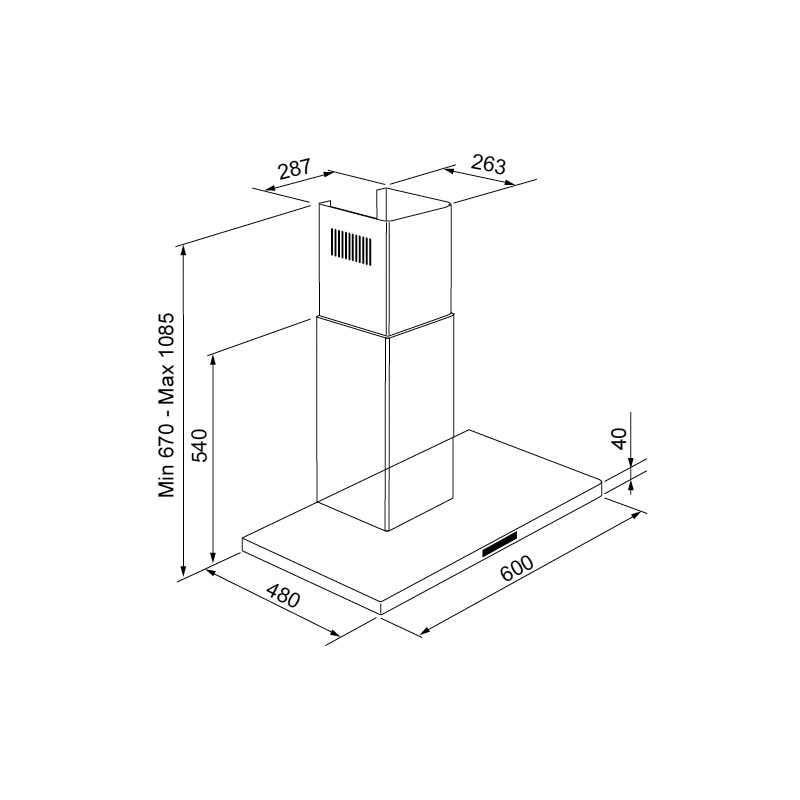 Performances• Évacuation ou recyclage• Débit maximum d’aspiration (norme EN61591) . en sortie libre : 765 m³/h . en évacuation : 745 m³/h• Pression à la vitesse maximale : 449 Pa• Niveau sonore à la vitesse min./max./int.(norme EN60704-2-3) : 39/60/70 dB(A)Confort d’utilisation• Commandes sensitives• Affichage digital de la vitesse• 3 vitesses d’aspiration + 1 intensive• Fonction Booster : accroît à son maximum• le débit de la hotte pendant 7 minutes• Fonction Timer : diffère l’arrêt de la hotte de 7 minutes• Spots LED 2 x 1,3 W• Clapet anti-retour livré de sérieFiltres• 2 filtres à graisse métalliques, lavables au lave-vaisselle• 1 filtre anti-odeurs à charbon actif CR400 livré de série• Puissance électrique d’installation : 282,6 W• 10 A - 220/240 V - 50/60 Hz• Cordon d’alimentation : 133 cm - Avec prise• Distance min. hotte/plan de cuisson électrique : 650mm• Distance min. hotte/plan de cuisson gaz : 750mm