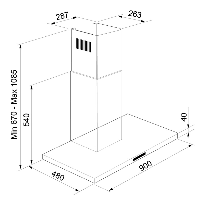 Performances• Évacuation ou recyclage• Débit maximum d’aspiration (norme EN61591) - en sortie libre : 765 m³/h - en évacuation : 745 m³/h• Pression à la vitesse maximale : 449 Pa• Niveau sonore à la vitesse min./max./int.(norme EN60704-2-3) : 39/60/70 dB(A)Confort d’utilisation• Commandes sensitives• Affichage digital de la vitesse• 3 vitesses d’aspiration + 1 intensive• Fonction Booster : accroît à son maximum• le débit de la hotte pendant 7 minutes• Fonction Timer : diffère l’arrêt de la hotte de 7 minutes• Spots LED 2 x 1,3 W• Clapet anti-retour livré de sérieFiltres• 3 filtres à graisse métalliques, lavables au lave-vaisselle• 1 filtre anti-odeurs à charbon actif CR400 livré de série• Puissance électrique d’installation : 282,6 W• 10 A - 220/240 V - 50/60 Hz• Cordon d’alimentation : 133 cm - Avec prise• Distance min. hotte/plan de cuisson électrique : 650mm• Distance min. hotte/plan de cuisson gaz : 750mm