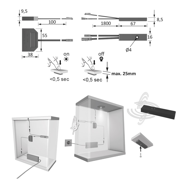 Fonctionne à travers des surfaces non métalliques, comme le bois, le verre, la céramique, jusqu'à une épaisseur de 25mm.Câble d'alimentation longueur 1800 mm, équipé de mini prise M1.