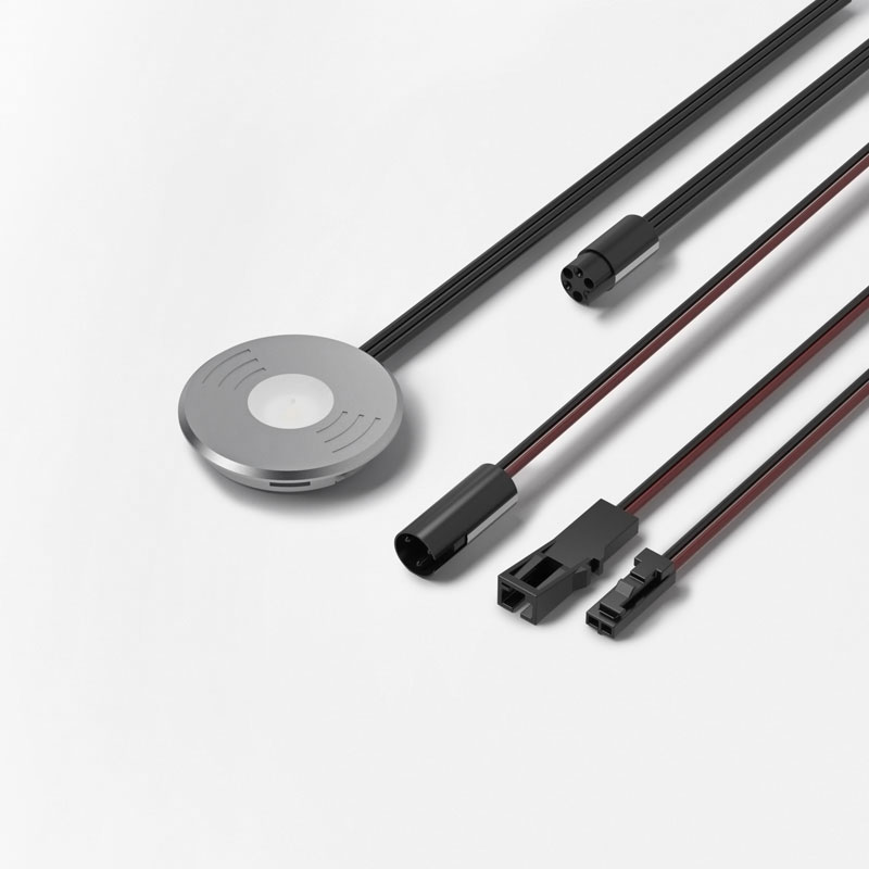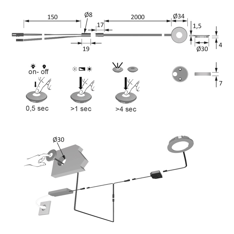 Interrupteur sensitif et lumineux avec fonction de variateur. Un léger contact allume ou éteint la lumière.Un contact prolongé modifie l'intensité de lumière.Pose en applique ou encastrée.Se branche entre l'alimentation et spots, applique, bande leds,… équipés de prises M1. Puissance utilisable maxi 36W. Consommation en veille <0,5W. Câble équipé de mini prises M1 longueur 2000.
