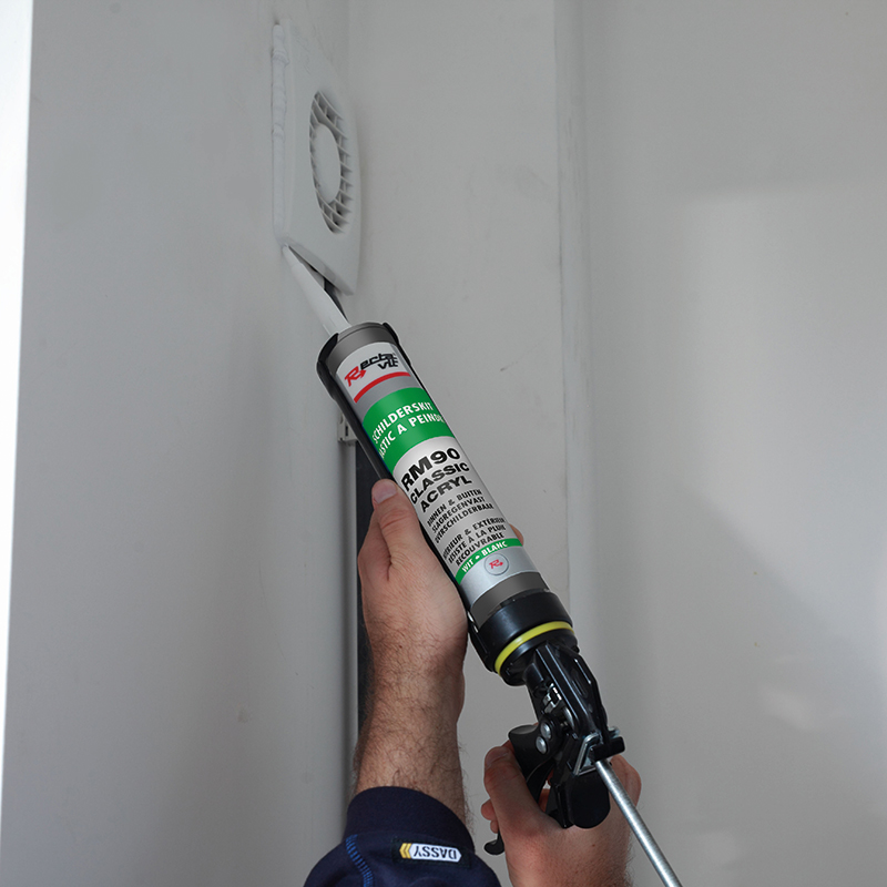 Mastic acrylique à peindre pour applications intérieures, tels que les fenêtres, portes, escaliers, plafonds, murs, plinthes.Peut être appliqué sur la plupart des matériaux de construction poreux : pierre, béton, brique, plâtrage, bois, ciment, mais aussi l’aluminium.Recouvrable après 30 minutes.Uniquement pour des applications à l’intérieur.Ne pas appliquer sur PE, PP, Téflon® (PTFE/PFA/FEP), des supports bitumineux, pierre naturelle, verre ou métauxferreux.Facile à appliquer et à lisser.Bonne tenue de la teinte et pelliculisation rapide.Finition étanche à l'eau.Recouvrable avec la plupart des systèmes de peinture.