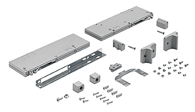 Pour TopLine L Kit d'amortisseurs de fermeture Silent System pour une ouverture superposée, 2 portesRetour automatique réglableRéserve de performance pour les poids de portes importantsKit composé de : 2 amortisseurs de fermeture 3 activateurs 1 tôle d'assemblage pour le montage du panneau supérieur 2 adaptateurs de fixation 2 butées de fin de course Accessoires de fixation