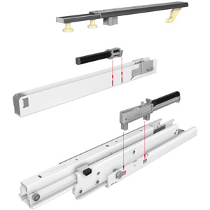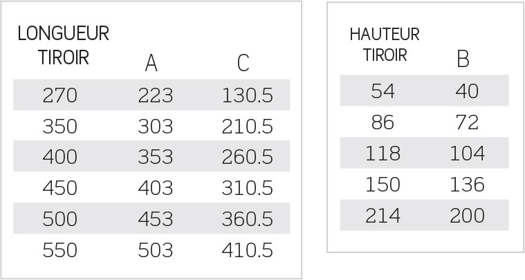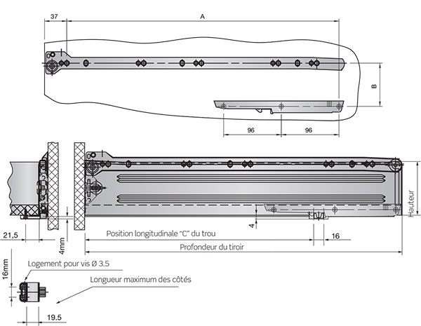 Montage sur tiroirs bois simple paroi.Fixation latérale.Montage droite ou gauche.Entraîneur réglable à fixation latérale.