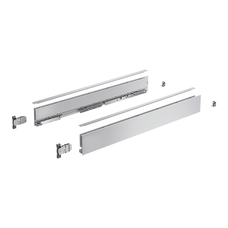 - 1 profil de côté de tiroir, à droite et à gauche- 2 profilés design dans la couleur du profil de côté de tiroir- 2 attaches façade à visser (nouveaux kits sans attaches façades, à commander séparément).- 2 stabilisateurs pour la paroi arrière- Accessoires de fixation