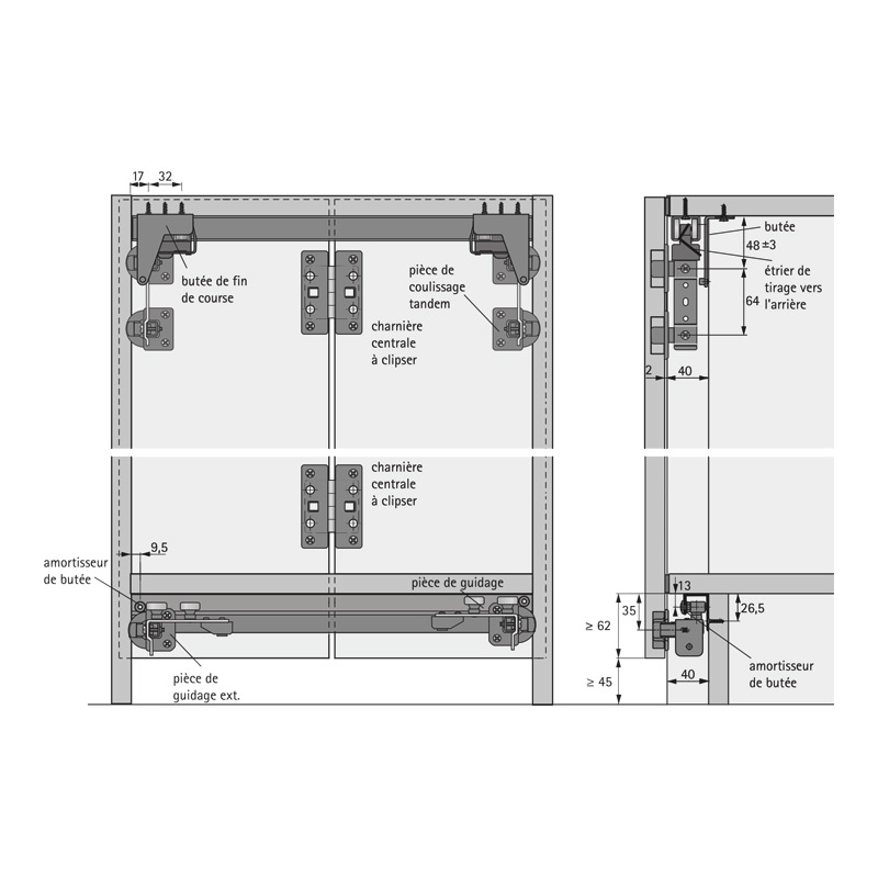 Le kit comprend toutes les pièces nécessaires pour 1 porte coulissante pliante à 2 vantauxIl est recommandé de ne pas dépasser la largeur intérieure du corps de meuble de 800 mm. La construction du panneau supérieur doit être conçue de manière à ce que le panneau supérieur ne puisse pas plier de plus de 1,5 mm sous la charge des portes pliées.Kit composé de :