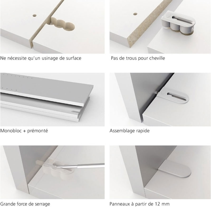 Système Cabineo 8 : Permet l'assemblage de montants centraux de 16mm minimum (un monobloc de chaque côté du montant central).Système Cabineo 12 :Permet l'assemblage de panneaux de 12mm minimum.Embout de vissage Cabineo :Permet un assemblage facile, stable et une grande force de serrage.Capuchon de protection Cabineo :Clipsable sur les 2 systemes Cabineo 8 et 12, pour une finition soignée.