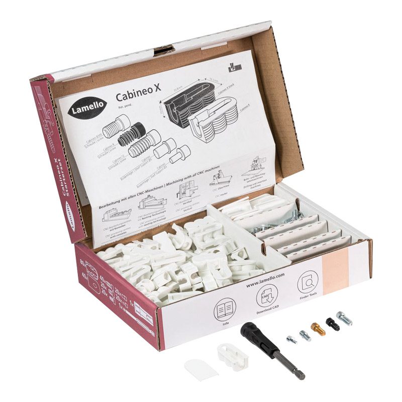 Ce kit comprend : Cabineo X (80 pièces) Vis Cabineo 12 (40 pièces) Variantes de vis ou taquet d'étagère (20 pièces de chaque) Capuchon de protection blanc de sécurité (40 pièces) Embout de vissage six [...]