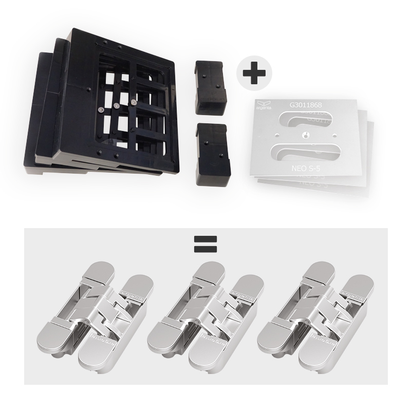 Kit composé de :- 1 gabarit de fraisage pour charnières invisibles et paumelles Argenta réf. 191 00000 00002- 3 plaques d'insertion pour charnières NEO-S5 réf. 191 00040 00061- 3 charnières invisibles NEO-S5 zamack chromé mat (offertes) réf. 191 00400 00033.