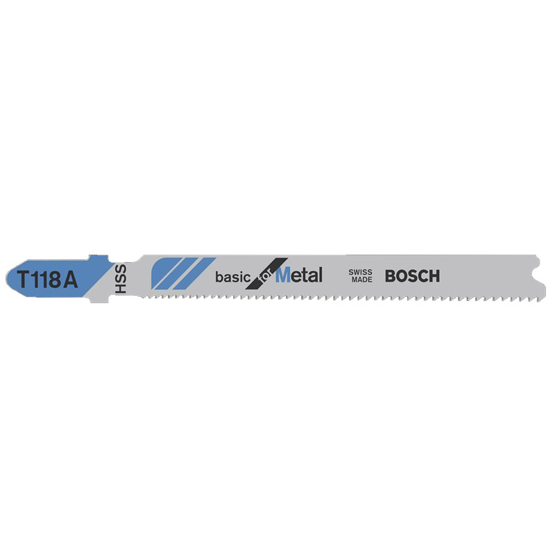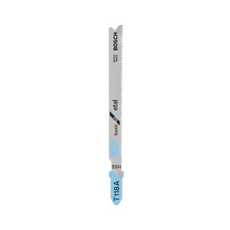 Lame de scie sauteuse "T 118 A Basic for Metal" pour des découpes rectilignes dans le métal.Denture ondulée et fraisée idéale pour les découpes sans exigence particulière.Lame en acier trempé à coupe rapide de haute qualité pour la découpe de tôles standards non perforées.Convient à toutes les scies sauteuses à emmanchement en T.