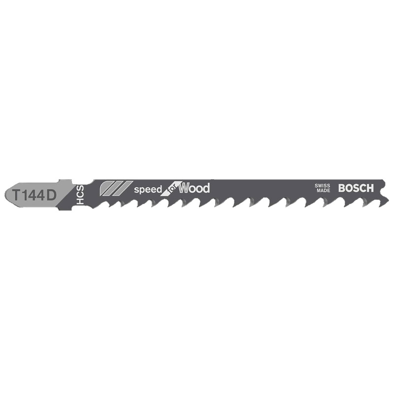 Lame de scie sauteuse "T 144 D Speed for Wood" pour la réalisation de découpes rectilignes et rapides dans le bois.Denture latérale tranchante favorisant des résultats rapides.Lame d’acier à haute teneur en carbone pour la découpe dans le bois tendre et les matériaux de menuiserie non abrasifs.Convient à toutes les scies sauteuses à emmanchement en T.HCS, avoyée, rectifiée.