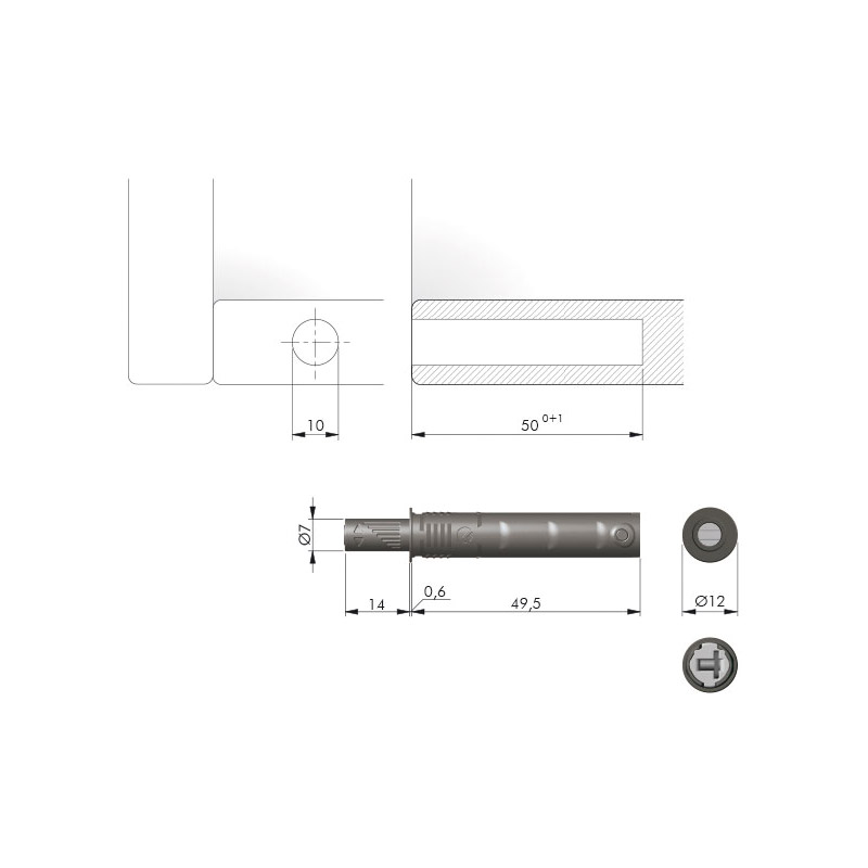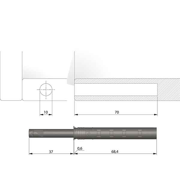 Livré avec gâche.Réglage du piston 6 mm.Corps et embase plastique.Encastrement Ø 10 mm.