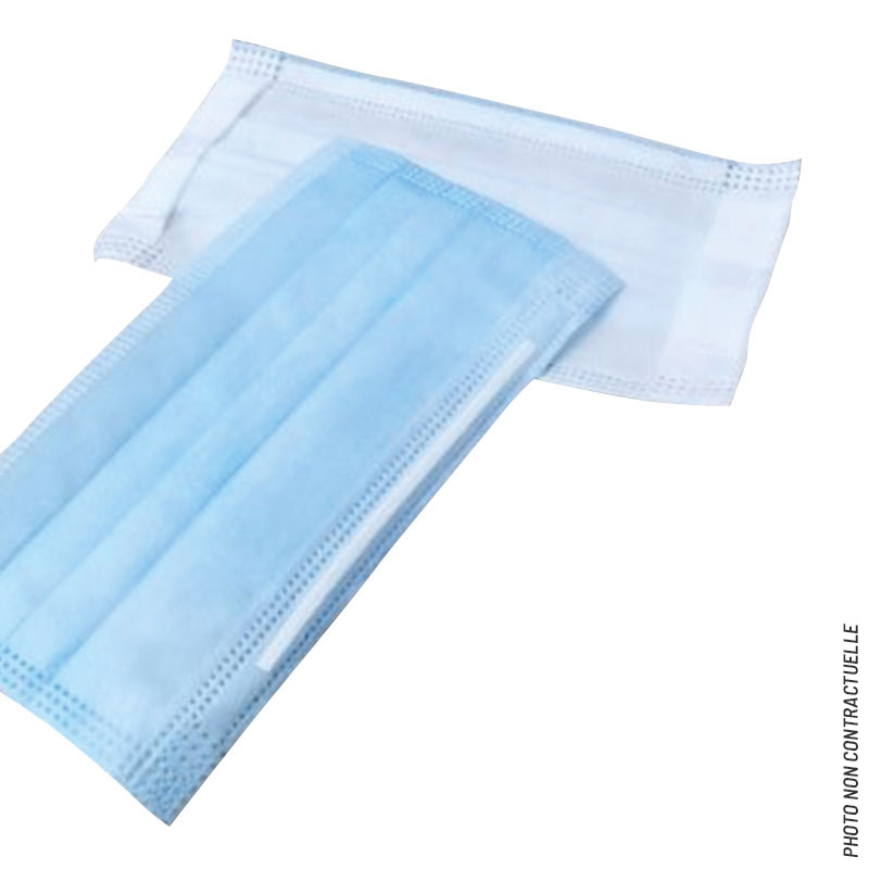 Masque de protection3 Couches non tissées avec serre nez métallique et élastiques de maintien aux oreilles.Norme : EN 14683Protection anti bactérienne (>95%)