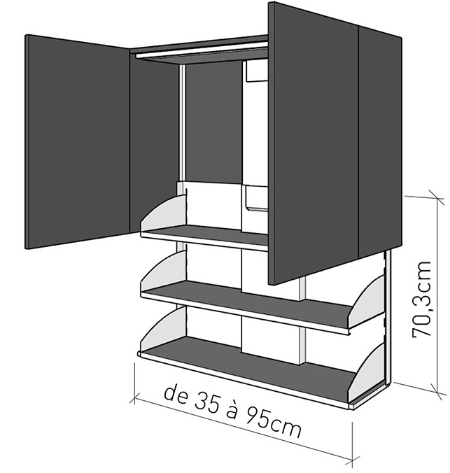 Pas de renfort mural nécessaire.Peut s’intégrer dans un meuble existant. L’interrupteur de commande s’intègre facilement au mobilier.Les mécanismes sont vendus seuls (le mobilier peutêtre fourni sur demande)ATTENTION : Les crédences murales doivent être adaptées, afin de ne pas gêner la descente.Les étagères sont réglables sur crémaillères.Pour commander, préciser la largeur intérieure du meuble haut (le mécanisme mesure 5cm de moins que le meuble), et la profondeur voulue (265 ou 310 mm).