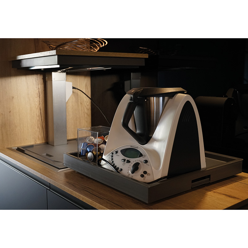 Mécanisme à hauteur variable à intégrer dans un plan de travail. Fait monter ou descendre un élément rangé sur plan de travail (petits électroménagers tel que les robot ménager, machine [...]