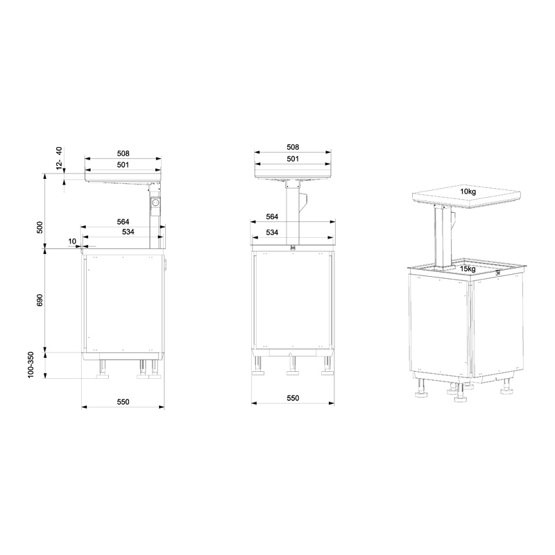 Mécanisme à hauteur variable à intégrer dans un plan de travail. Fait monter ou descendre un élément rangé sur plan de travail (petits électroménagers tel que les robot ménager, machine à café, presse agrume...).Course de 500mm maximum.Vitesse de 38mm/s.Sécurité anti-pincement (capteur électronique entièrement intégré dans la colonne).Supporte une charge maxi de 15kg équitablement répartie par plateau (mobilier compris).L'interrupteur de commande est intégré sur la cornière sur le plan de travail, et d'une simple pression il est possible d'accéder aux éléments stockés sur les plateaux.Le plateau bas étant extractible, il n'est pas nécessaire de soulever les appareils, ils se déplacent en toute simplicité.Prise intégrée dans le mécanisme pour branchement d'un robot ménager.