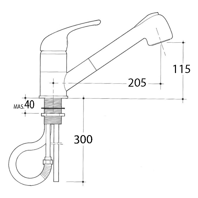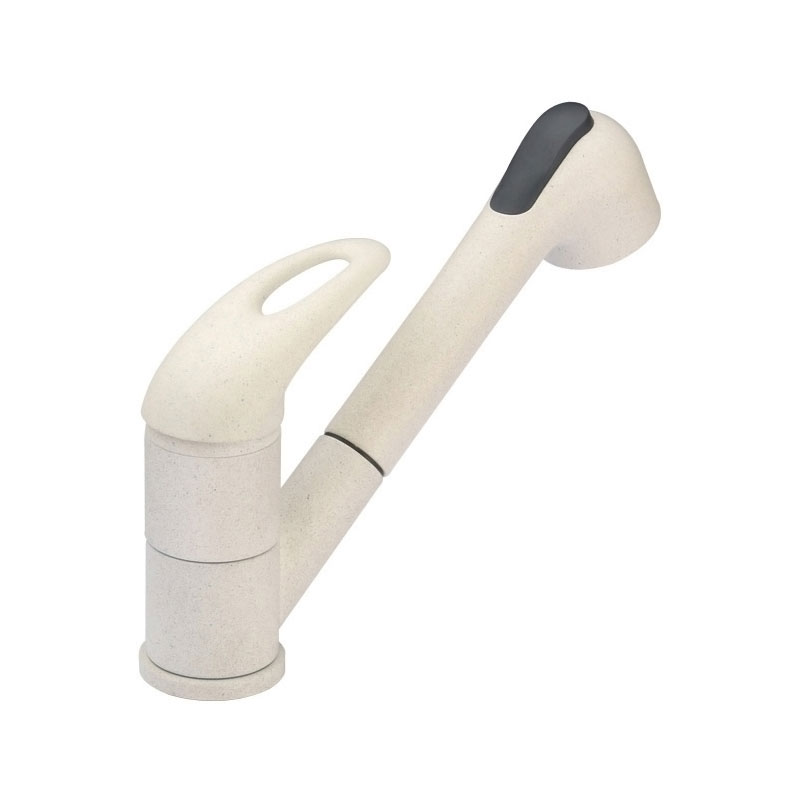 Corps Ø50 avec bec orientable. Manette laiton, flexible de la douchette en nylon.Équipé d'une cartouche à disque céramique. Douchette extractible à 2 jets et mousseur.Livré avec flexibles d'alimentation inox.
