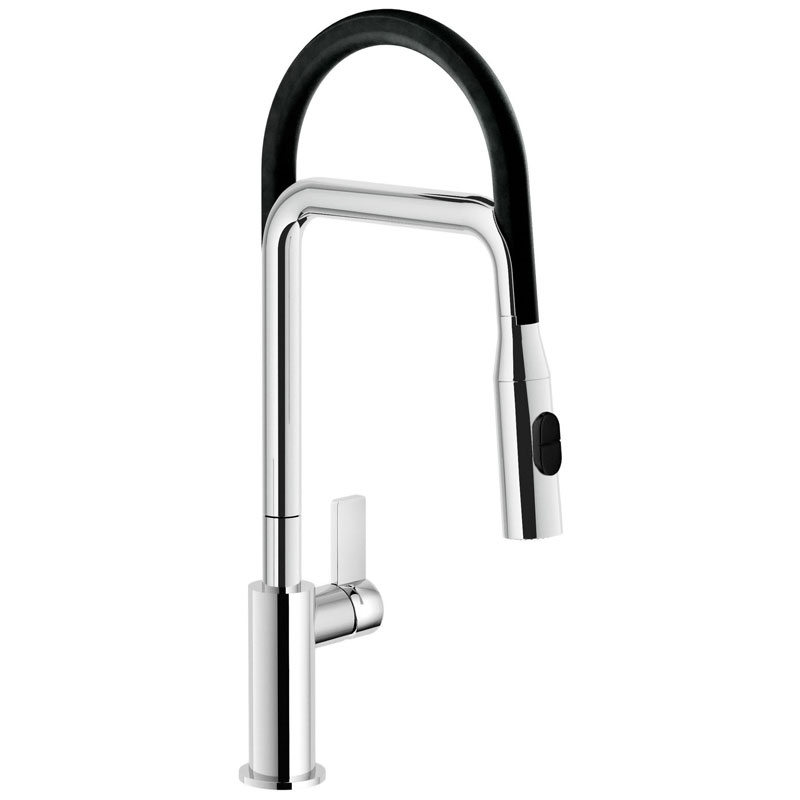 Avec limiteur du débit et réglage de la température de l’eau.Mousseur avec système anti-calcaire.Corps Ø22 mm avec bec orientable à 360°, et douchette amovible non extractible à 2 jets.Equipé d’une cartouche céramique Ø28 mm.Corps et douchette chromés, flexible blanc ou noir.Livré avec flexible d'alimentation inox