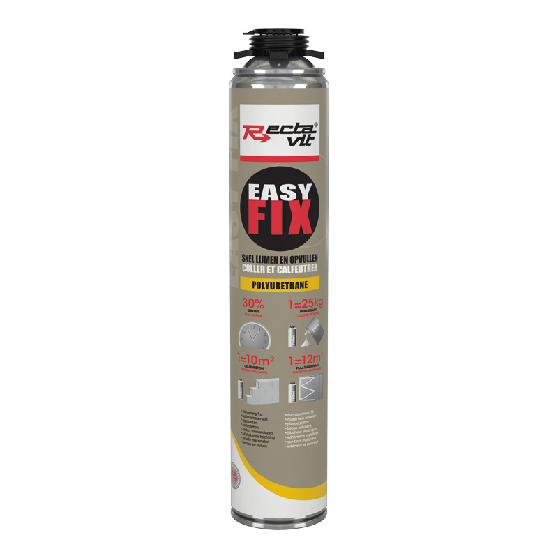 Application :Avec la valve vers le bas, secouer énergiquement pendant 30 secondes. Enlever le capuchon et visser la pipette (ou le pistolet) sur la bombe.Pour l'encollage de panneaux, de plaques ou d'éléments décoratifs directement sur le mur :Appliquer des cordons d'un diamètre de 30 mm de Rectavit Easy Fix le long du périmètre et en zigzag au milieu en tenant l'applicateur (pistolet ou pipette) droit sur le support à une distance de 1 à 2 cm. L'applicateur ne doit pas toucher la surface. Min. 30% de la surface doit être couvert de colle quand la plaque est pressée contre le mur.Durant l'application secouer régulièrement la bombe.Laisser reposer la colle pendant 4 à 5 min avant de positionner la plaque. Le temps ouvert maximal est de 8 min à 20°C.Positionner la plaque, bien presser ou marteler et maintenir ou fixer temporairement pendant max. 1 min.Boucher immédiatement les joints avec Rectavit Easy Fix.Laisser sécher le tout pendant au moins 1 h avant de continuer les travaux.Couper les excédents de colle.L'encollage de plaque sur un frame :Appliquer des cordons d'un diamètre de 30 mm de Rectavit Easy Fix sur le frame en tenant l'applicateur droit sur le support à une distance de 1 à 2 cm. L'applicateur ne doit pas toucher la surface.Durant l'application secouer régulièrement la bombe.Laisser reposer la colle pendant 4 à 5 min avant de positionner la plaque. Le temps ouvert maximal est de 8 min à 20°C.Positionner la plaque, bien presser ou marteler et maintenir ou fixer temporairement pendant max. 1 min.Boucher immédiatement les joints avec Rectavit Easy Fix.Laisser sécher le tout pendant au moins 1 h avant de continuer les travaux.Couper les excédents de colle.Après usage dévisser la pipette (ou pistolet) de la bombe, nettoyer l’embout de la bombe avec Rectavit PUR Cleaner et stocker la bombe verticalement.