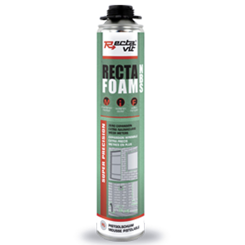 Mousse polyuréthane à 1 composant pistolable spécifiquement développée pour : le montage durable de fenêtres et portes.Rectavit Recta Foam NBS peut être appliquée sur la plupart des matériaux de construction : pierre, béton, bois, maçonnerie, métal, matière synthétique comme PVC dur, polystyrène, mousse PU, polyester.Spécifique pour monter des portes et des fenêtres, isoler, étanchéifier, remplir et monter. Pour la fixation des lattes de creux, pour le remplissage des creux, joints et ouvertures dans et autour des murs et des portes, comme câbles et conduites, pour le jointoyage, pour étanchéifier des joints entre matériaux légèrement déformants, pour étanchéifier des toitures, pour installer un écran acoustique ou une couche insonorisante, pour finir l'isolation dans un milieu frigorifique.Expansion minimale : pas de déformation des matériaux connectés.Energy+ : valeur d’isolation augmentée.Super rapide : 60% plus rapide grâce au dosage précis et durcissement rapide.Puissance : Très haute force d’adhérence sur la plupart des matériaux de construction.Durable : suit les vibrations et les mouvements de sorte que la mousse ne se déchire pas et que les ponts thermiques sont évités.ECO+ : inoffensif pour la couche d’ozone, neutre pour l’effet de serre.Peut-être repeint ou enduit de plâtre de finition.Résistant à l’eau et à la plupart des produits chimiques.Applicable à l’intérieur & l’extérieur.Ne pas appliquer sur PE, PP ou Téflon® (PTFE/PFA/FEP).