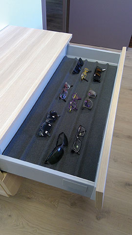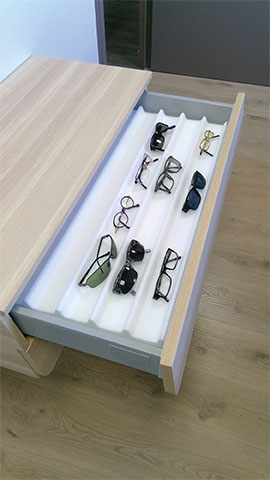 Plaque complète de mousse à recouper pour rangement de lunettes en fond de tiroir.La mousse semi-rigide peut être sortie du tiroir pour présentation des produits au client.