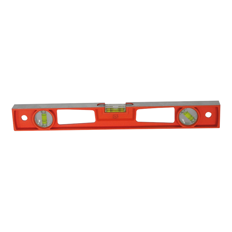 Corps massif en aluminium moulé de forme rectangulaire. Double poignée.3 fioles : horizontale, verticale et 45°. Semelle fraisée sur les 4 faces.