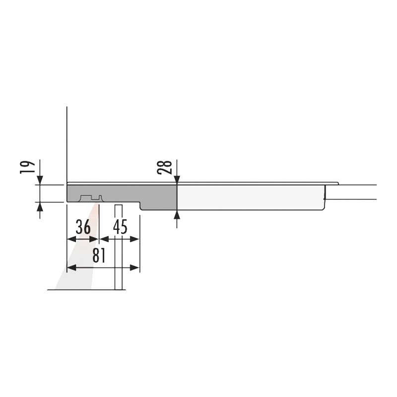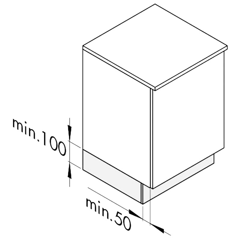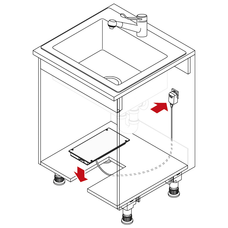 Le bloc se fixe sur le plancher du meuble de sorte que la cellule soit au bord de la porte, vous passez le pied et la porte s’ouvre. Nécessite une plinthe de 100 mm de hauteur.