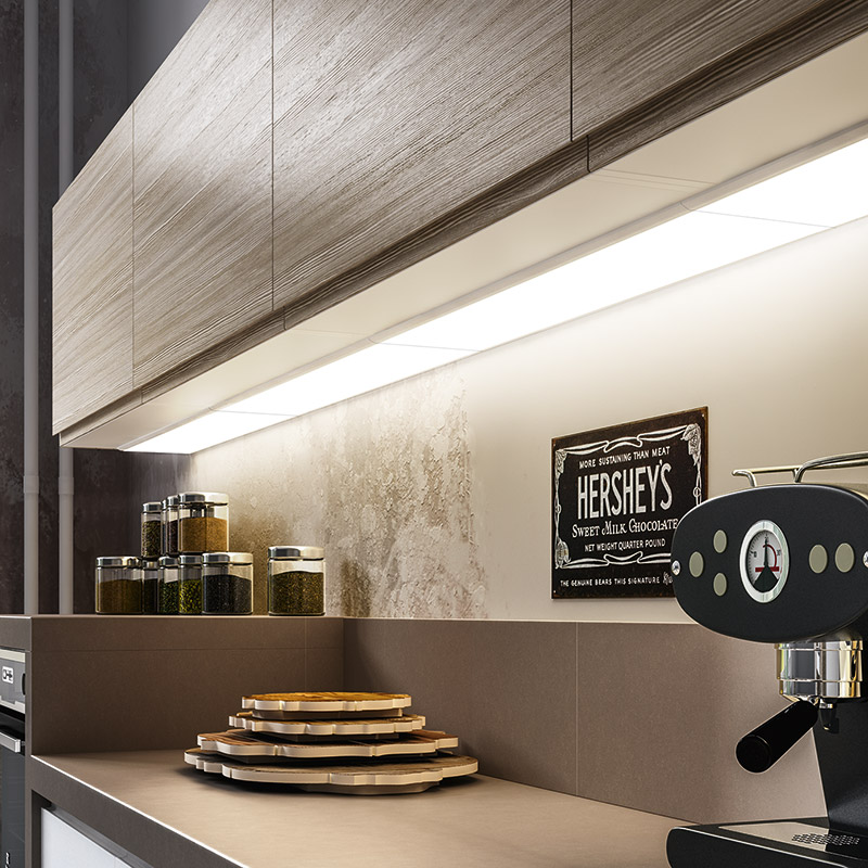 Se pose sous les éléments hauts de cuisine sous un bandeau, en façade ou sous une tablette.