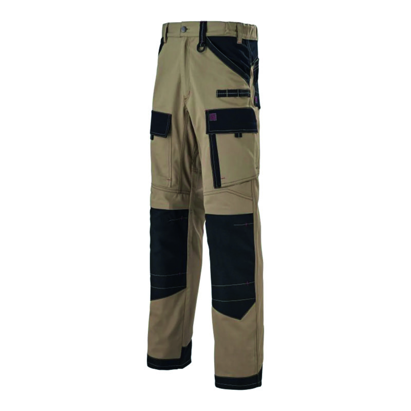 Ceinture élastiquée côté à 6 passants double.2 poches cavalière dont une avec poche monnaie.Sangle porte outils.2 poches cuisse à rabat fermé par grippers, une avec surpoche à 2 soufflets et rabat et l'autre avec 3 surpoches plaquées.Poches mousses genoux avec deux niveaux de réglages avec ouverture par le dessus en tissu renforcé.Renforts bas arrière du pantalon avec surpoche à soufflets fermée par rabat.Tissu label OEKO TEX.Tissu : Sergé 65 % coton, 35 %polyester 250 g.Conforme à la norme EN14404.