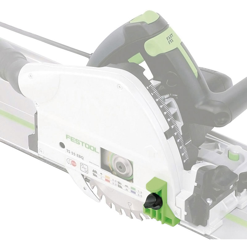 Le pare-éclats se monte à la place de la fenêtre d'inspection et réduit l'arrachement à droite de la lame de scie pendant la coupe. Une fois l'outil mis en marche, l'utilisateur entaille le pare-éclats monté pour l'adapter parfaitement à la lame de scie. Le pare-éclats peut être décalé en hauteur et convient donc à la coupe avec et sans rail de guidage.