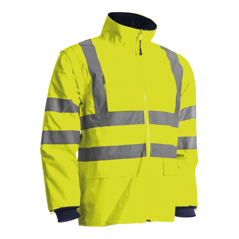 Parka 100% Polyester Oxford 300D fluorescent enduit Polyuréthane.Coutures étanchées, doublure Polyester pongé.Capuche 3 pans intégrée dans le col.Empiècements bleu marine aux épaules, bout des manches et bas du parka.Zipper central avec double curseur sous rabat jusqu'en haut du col.1 poche extérieur poitrine.2 poches intérieures (portefeuille + téléphone).Veste intérieure 2/1, manches amovibles 100% Polyester Oxford 300D fluorescent enduit PU.Doublure polaire (corps) et polyester matelassé (manches).Poignets tricot.1 poche intérieure avec étiquette d'identification.Parka et veste amovible : 2 bandes bretelles + 2 bandes ceintures microbilles rétro-réfléchissantes.Trappe d'accès pour le marquage.Avantages : Protection thermique accrue, forte imperméabilité, empiècements anti-salissure.Conforme aux normes CE, EN ISO 20471:2013 + A1:2016, EN342:2017, EN343:2003 + A1:2007 et EN343:2019.