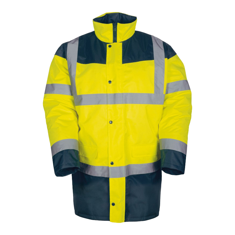 Parka polyester non respirant.Extérieur en polyester Oxford enduit polyuréthane imperméable fluorescent (70% polyester et 30 % polyuréthane).Couleurs sombres en polyester Oxford enduit PVC imperméable (70 % polyester et 30 % PVC).Coutures étanchées.Isolation en polyester 180g/m2.Bandes rétroréfléchissantes Scotchlite 3M (2 en ceinture, 2 brassards par manche, 2 bretelles dos et devant).Col droit à capuche intégrée.Capuche à fermeture cordon.Fermeture à glissière double sens avec rabat pressions.Manches kimono avec poignets coupe vent tricot intérieur.2 poches extérieur bas plaquées à rabat.1 poche intérieur gauche portefeuille à fermeture scratch.