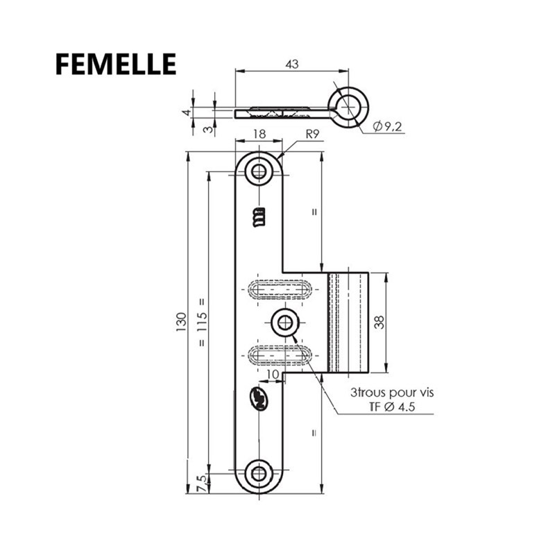 Paumelle universelle pour huisserie bois.Dimensions paumelle montée : 130x86mm - épaisseur 3mm.Réglage possible de la paumelle sans démontage de la porte, par le dessus et le dessous de l'axe (+/- 2.5mm en hauteur).Certifiée NF, garantie 200 000 cycles ouverture/fermeture pour une porte de 80 kg.Peut remplacer une paumelle 6050.