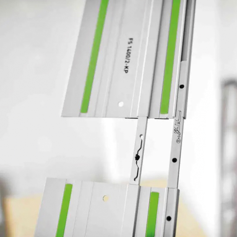 Pièce de raccordement pour assemblage rectiligne de deux rails de guidage pour le travail de pièces longues.
