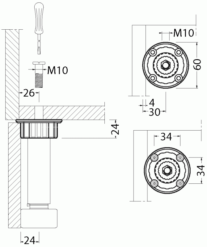 Pied ABS noir Ø 28mm avec vérin et embase de fixation démontable à 4 trous de vis. Trou central fileté M10 pour recevoir une vis creuse.