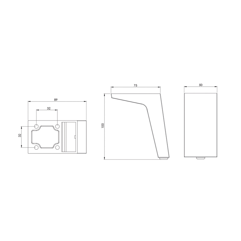 Pied de meuble incliné, avec vérin de réglage.Platine largeur 50mm longueur 75mm.