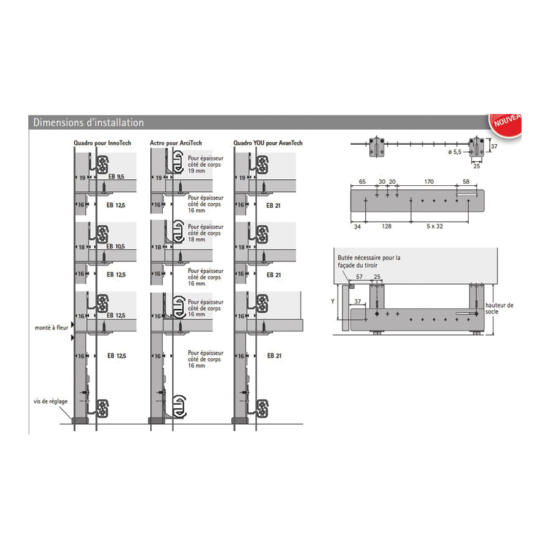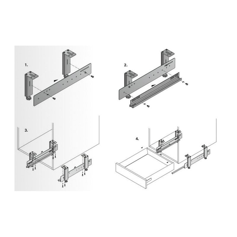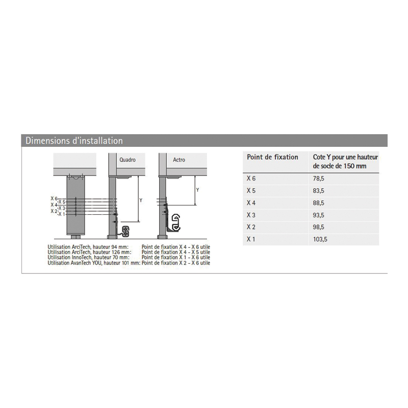 Ce kit permet de recevoir au niveau des plinthes un tiroir avec façade hauteur 150 mm équipé de coulisses Hettich AvanTech YOU, ArciTech, Atira ou tiroir bois type Quadro YOU, Actro, Quadro 25 et Quadro V6.Charge par pied 75 kg.