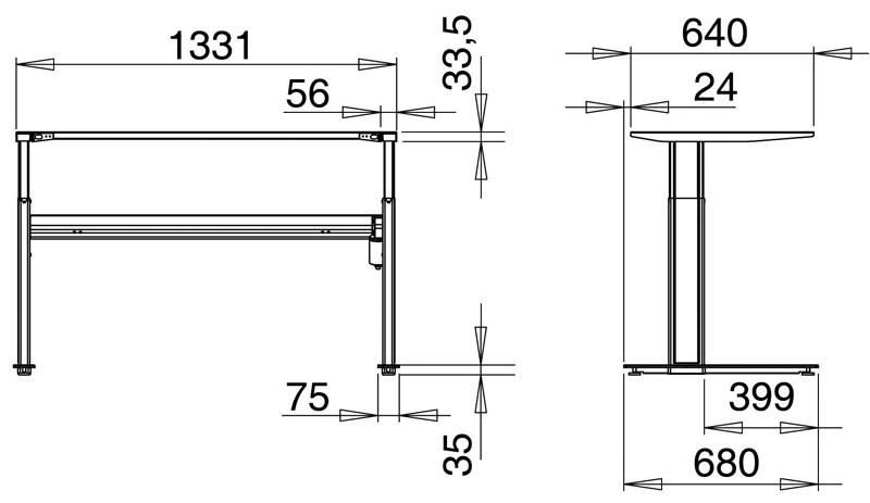 Motorisation à commande par touches montée/descente.Hauteur réglable en continu de 660 à 1160 mm.Largeur chassis 1330 mm.Dimensions de plateau recommandées :- Largeur 1400 mm.- Profondeur de 700 à 1200 mm (selon la forme du plateau).