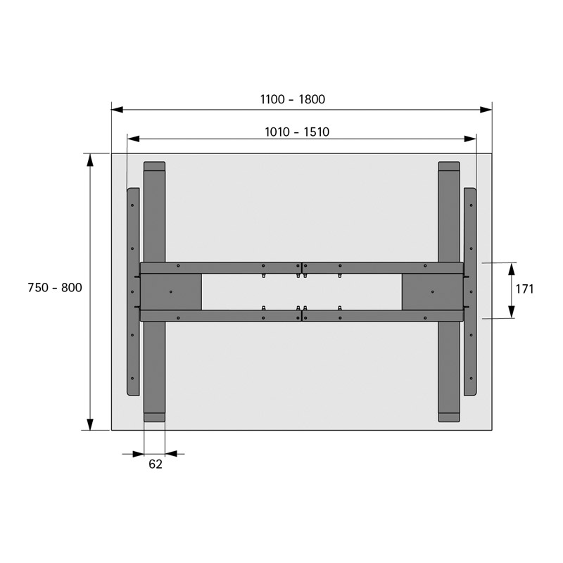 Piètement de table réglable en hauteur par moteur électrique.Colonnes de levage simple développement télescopiques de 60 x 60 mm.Pour des plateaux de table ou de bureau variables : - profondeur 750 à 800 mm - largeur 1100 à 1800 mmRéglage en hauteur de 690 à 1180 mm.Course de levage de 490 mm.Capacité de levage maxi 100 kg avec une charge uniforme de la table (Capacité de levage = charge utile + plateau de table).Réglage en hauteur avec démarrage en douceur.Tension nominale 100 - 240 V / 50 - 60 Hz.Faible consommation d’énergie (mode veille 0,3 W).Vitesse de réglage 39 mm/s.Détection de collisions (pas de protection des personnes).Kit composé de :
