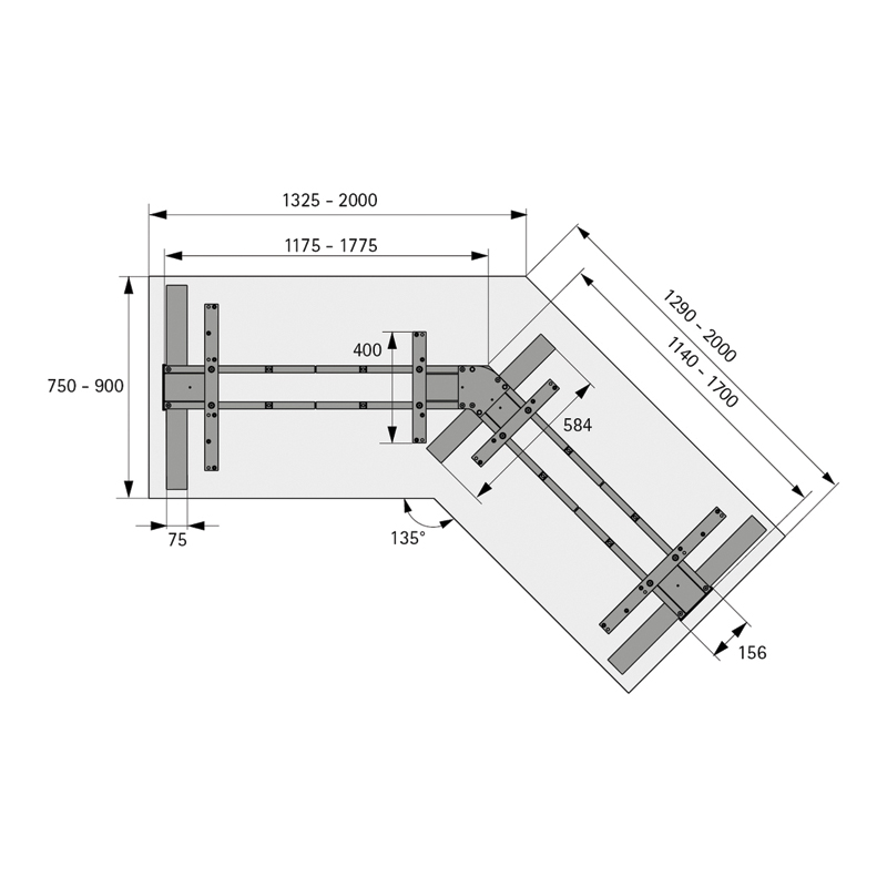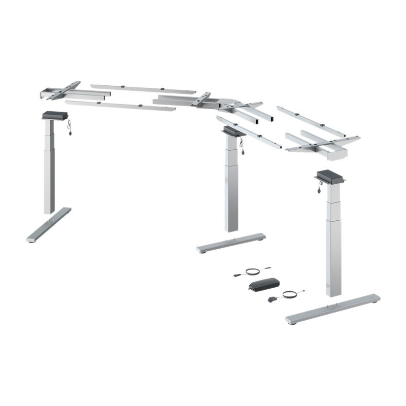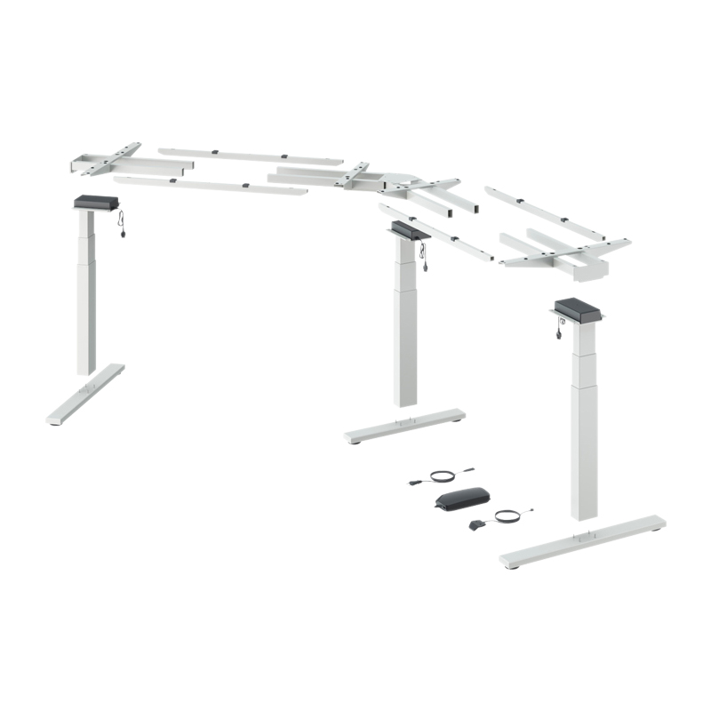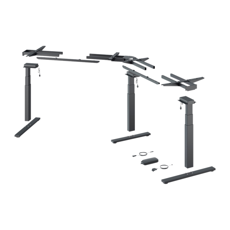 Piètement de table réglable en hauteur par moteur électrique pour plateaux de table en angle.Colonnes de levage double développement télescopiques de 60 x 90 mm.Pour des plateaux de table ou de bureau variables : - profondeur 750 à 900 mm - largeur 1325 - 2000 mm / 1290 - 2000 mmRéglage en hauteur de 625 à 1285 mm.Course de levage de 660 mm.Capacité de levage maxi 150 kg avec une charge uniforme de la table (Capacité de levage = charge utile + plateau de table).Réglage en hauteur avec démarrage en douceur.Tension nominale 100 - 240 V / 50 - 60 Hz.Faible consommation d’énergie (mode veille 0,3 W).Vitesse de réglage 39 mm/s.Détection de collisions (pas de protection des personnes).Kit composé de :