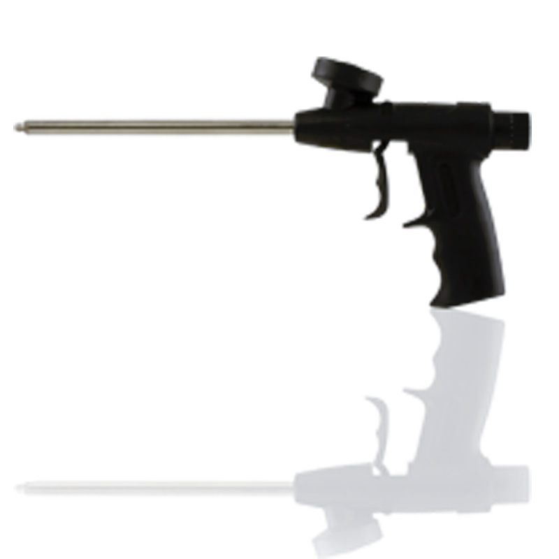 Pistolet doseur pour l'application de mousse PU avec le système à vis NBS (PVC).Réglage de la quantité à doser.La bombonne peut rester branchée quelques jours sans que la mousse durcisse.