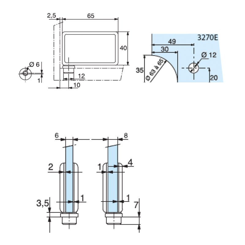 Pivots haut et bas pour porte verre, équipés d'un axe rétractable facilitant la pose.Encastrables à perçage décentré pour faire l'ajustement.Serrage par contreplaque.Montage sur encoche 3270E.