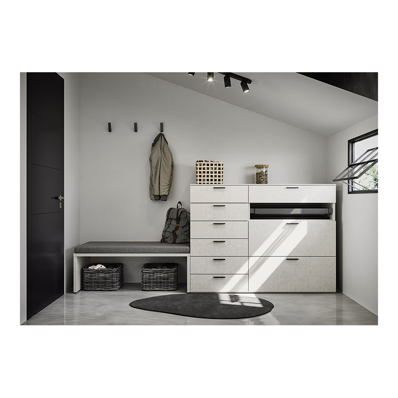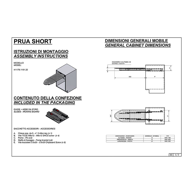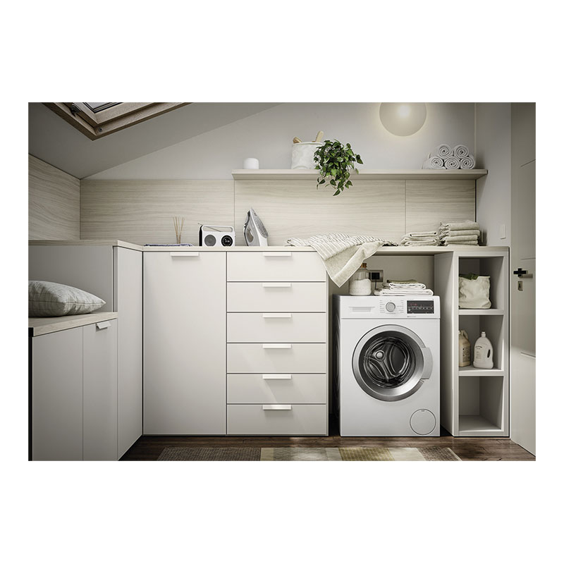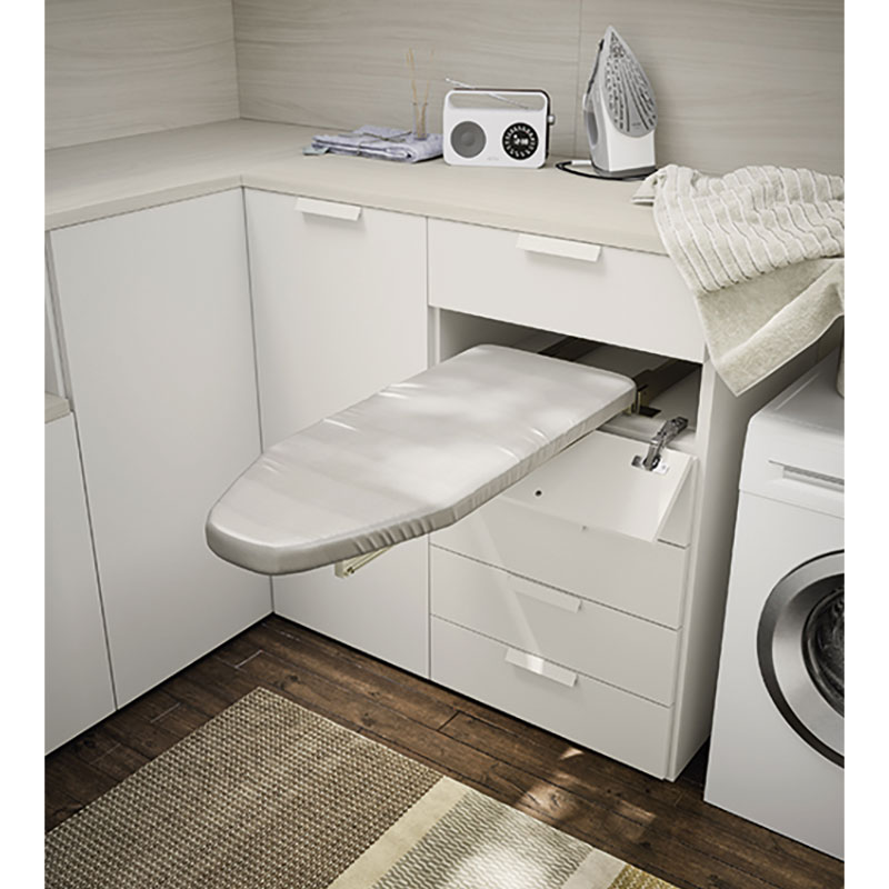 Prua Short est une planche à repasser peu encombrante installée dans un tiroir de taille standard. Ouvrez simplement l'avant du tiroir à charnière pour utiliser la planche à repasser. Prua Short crée une petite table à repasser pratique et optimale à installer dans une buanderie ou une salle de bain, mais aussi dans la cuisine, la chambre ou le dressing, augmentant la fonctionnalité des petits espaces et la polyvalence de n'importe quelle maison. Le mécanisme est fourni avec un plateau en bouleau et un tissu gris résistant à la chaleur.