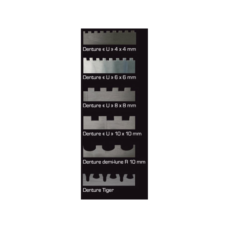 6 lames interchangeables à dentures différentes : - 1 en U 4 x 4 mm - 1 en U 6 x 6 mm - 1 en U 8 x 8 mm - 1 en U 10 x 10 mm - 1 en demi-lune R 10 mm - 1 en Tiger lames en acier inoxydable pour une haute résistance à l'usure poignée grip ergonomique en élastomère poignée de verrouillage à glissière assurant un placement sûr et ajustable le long de la lame système de drainage du coffret permettant le séchage des platoirs pendant le stockage.