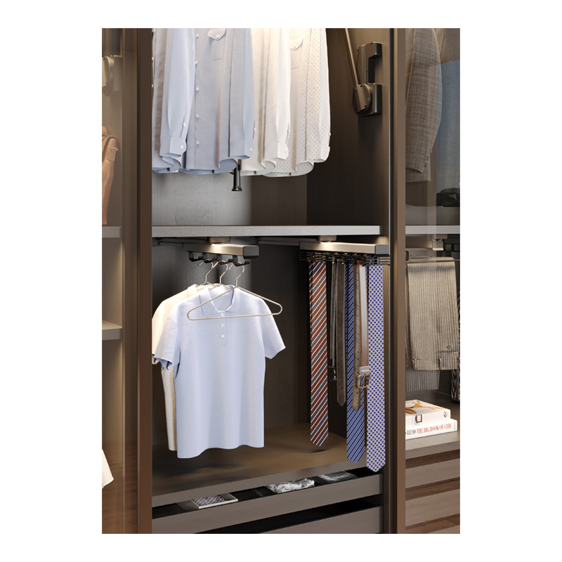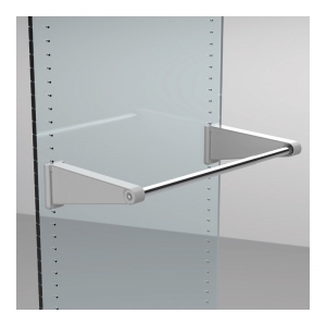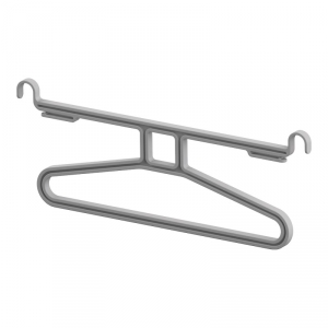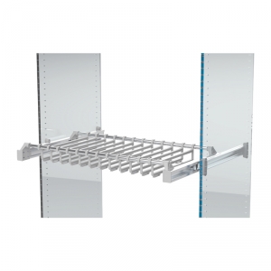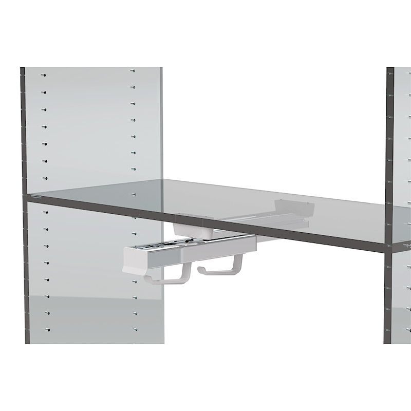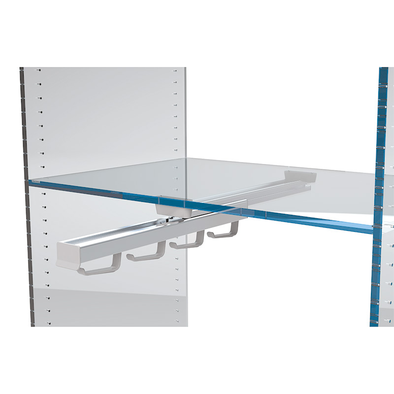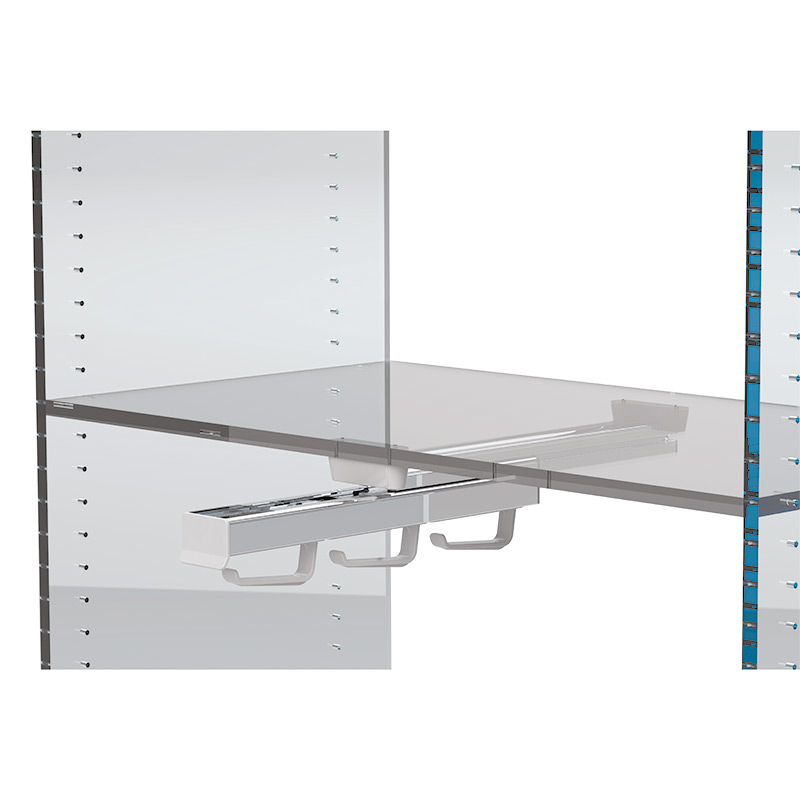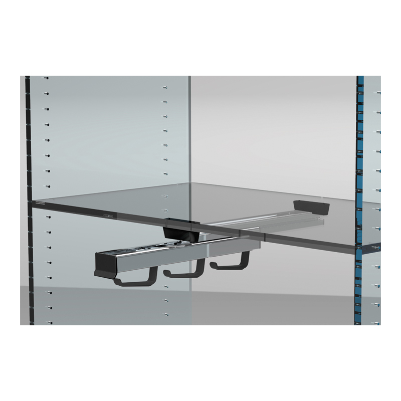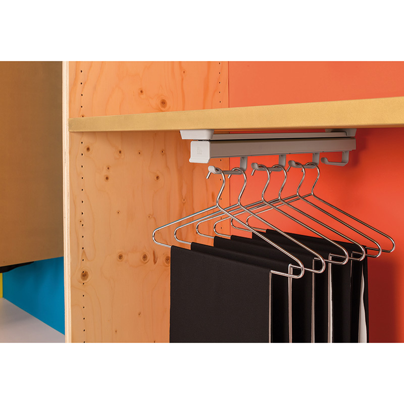Porte-cintres monté sur coulisse aluminium à sortie partielle.Fixation sous étagère. Peut recevoir jusqu'à 4 cintres par crochet.Crochets en nylon renforcé de fibre de verre.Livré avec fixations.