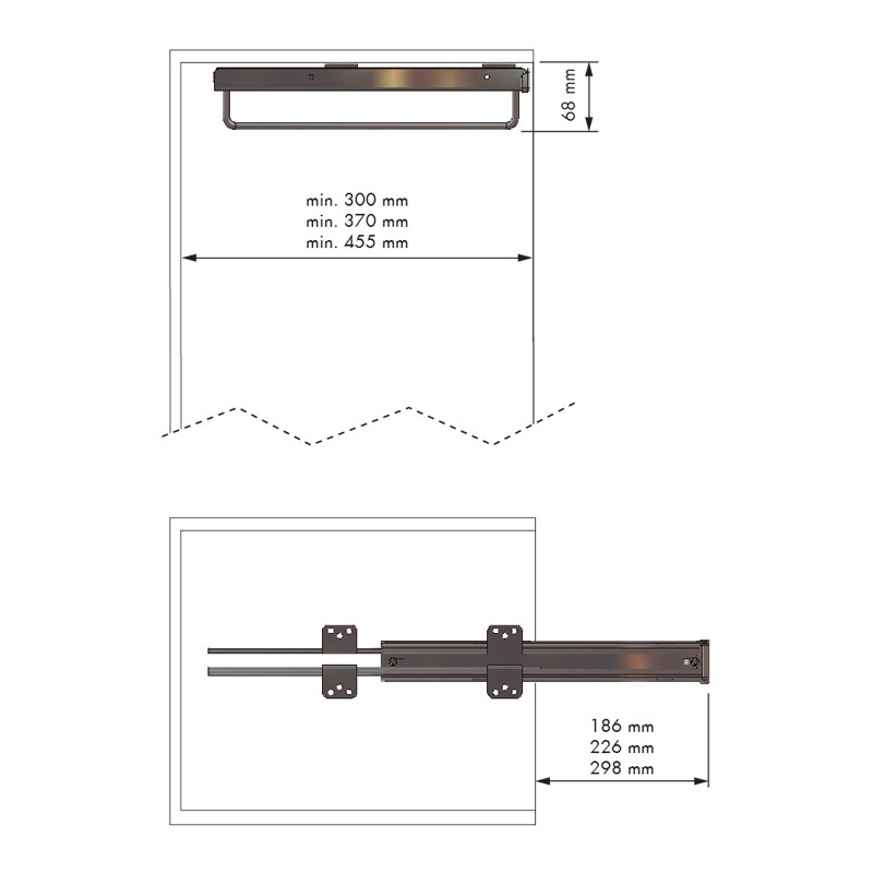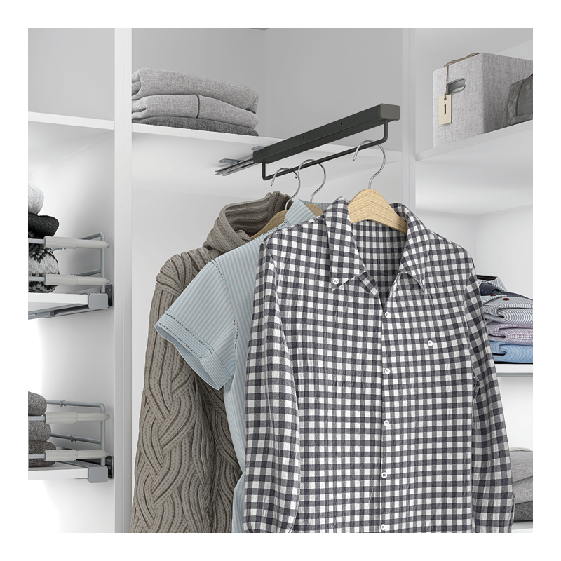 Porte cintres en fil d'acier.Sur coulisse à bille, sortie 3/4.Fixation sous tablette.
